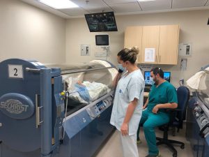 ״מדובר בטיפול במהלכו הנפגעים מקבלים חמצן רפואי טהור (ריכוז 100%) ומוכנסים אל תא לחץ בלחץ אטמוספרי גבוה פי 2-3 מהלחץ הסטנדרטי בחוץ, במקרה של שאיפת עשן קשה (הרעלת גז CO) הטיפול בתא לחץ הינו טיפול הבחירה, והוא מוכר ומאושר ע"י משרד הבריאות. אנו מטפלים בהדסה במגוון מצבים רפואיים בתא לחץ, בינהם טיפול בפצעים קשיי ריפוי, נזקי קרינה, ומקרים דחופים כגון תסחיף אויר, והרעלת גז CO ובכל ההתוויות הנוספות על פי הנחיות משרד הבריאות וההתאחדויות לרפואה היפרברית".