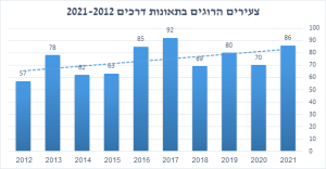 בירושלים נפגעו 335 צעירים (15-24) בתאונות דרכים בשנת 2021, מהם שמונה נהרגו ו-36 נפצעו קשה. בעשור החולף (2012-2021) נפגעו בירושלים 3,561 צעירים, מהם 32 נהרגו.