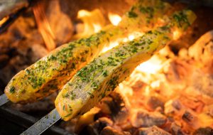 לברק שלם על גחלים – עטוף בשמן זית, שום, טימין, כוסברה ורוזמרין, נצרב על גריל פחמים. מוגש עם תערובת שמן זית ומלח אטלנטי 40 ₪ ל-100 גרם